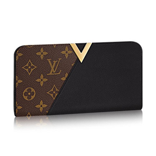 Впечатляващият портфейл Kimono съчетава емблематично монограмно платно и цветна телешка кожа за графичен дизайн. Привличащият вниманието златист V-образен подпис, вдъхновен от винтидж рекламна кампания на Louis Vuitton, придава перфектен завършек на този женствен портфейл.
