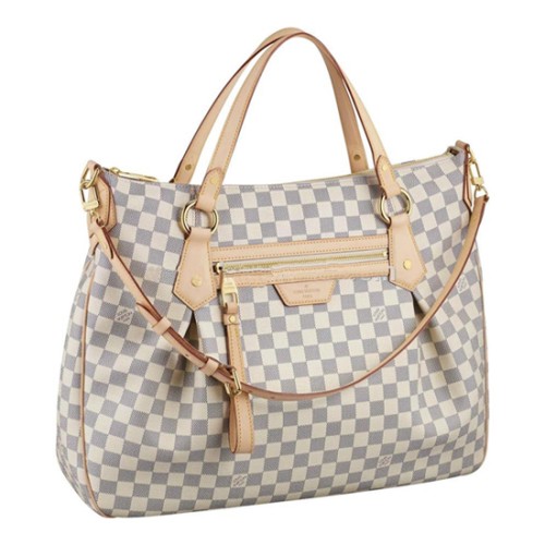 С луксозни гарнитури от телешка кожа и богат златист месинг, щедрата Evora GM е без усилие елегантна. Изработена от мек плат Damier Azur, нейните женствени плисета и извита форма излъчват изтънченост.