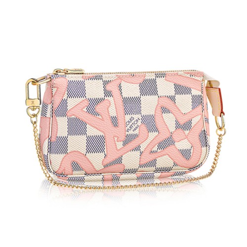 Чантата Mini Pochette Accessoires е с свежо и женствено лятно усещане, изработена от плат Damier Azur, покрит с пъстър монограмен принт, адаптиран от архивите на Louis Vuitton. Идеална е за съхранение на важни вещи и може да се прикрепи към чанта.