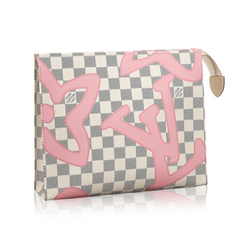 Шикозната и практична несесеричка за тоалетни принадлежности е с свежо, женствено усещане за лятото, изработена от плат Damier Azur, покрит с пъстър монограмен принт, адаптиран от архивите на Louis Vuitton