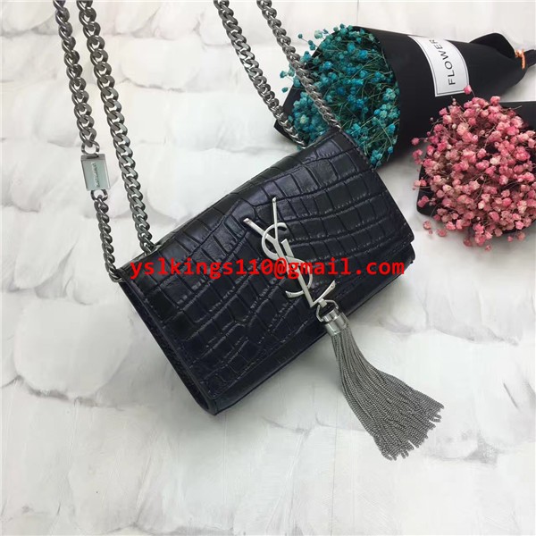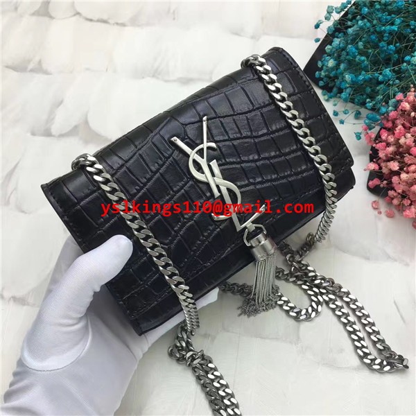 Чанта с пискюли YSL, 17 см, крокодилско черно и сребристо
