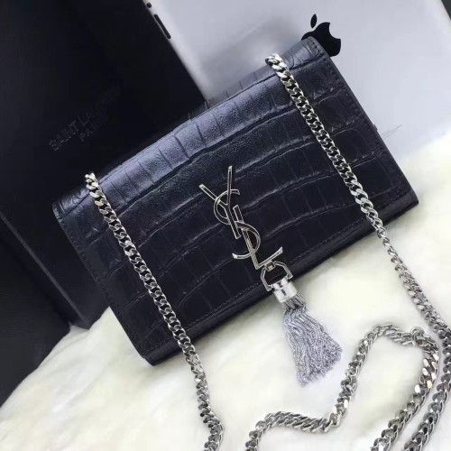 Чанта с пискюли YSL 22 см, крокодилско черно и сребристо