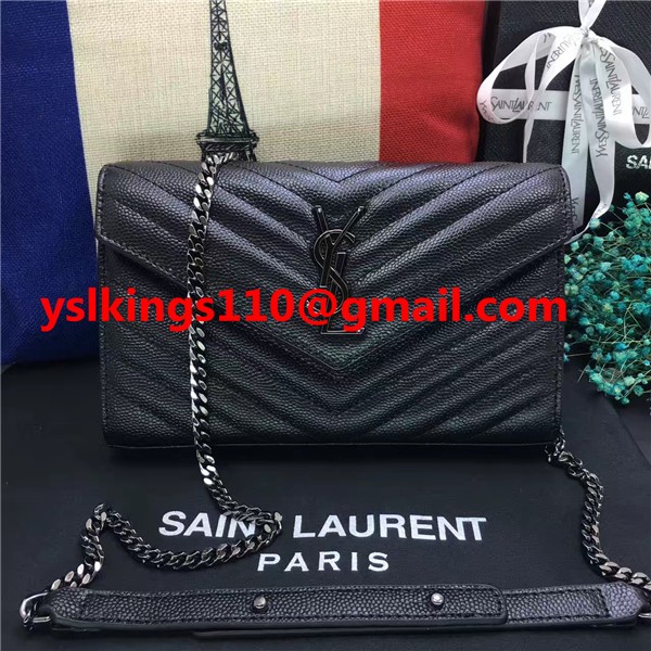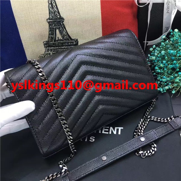 Чанта-плик YSL, кожена, черна, сребърна, верижка 23 см
